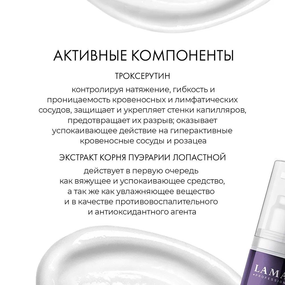 Помогает бороться с куперозом, способствует снижению покраснения, интенсивно увлажняет, тонизирует и смягчает кожу. Троксерутин участвует в окислительно-восстановительных процессах, блокирует гиалуронидазу, стабилизирует гиалуроновую кислоту клеточных мембран и уменьшает проницаемость и ломкость капилляров, увеличивает их тонус. Экстракт кудзу содержит противовоспалительные вещества, обладающие способностью быстро успокаивать кожу. Применение: нанести крем на сухую, чистую кожу лица и шеи легкими массажными движениями. Рекомендуется использовать ежедневно.